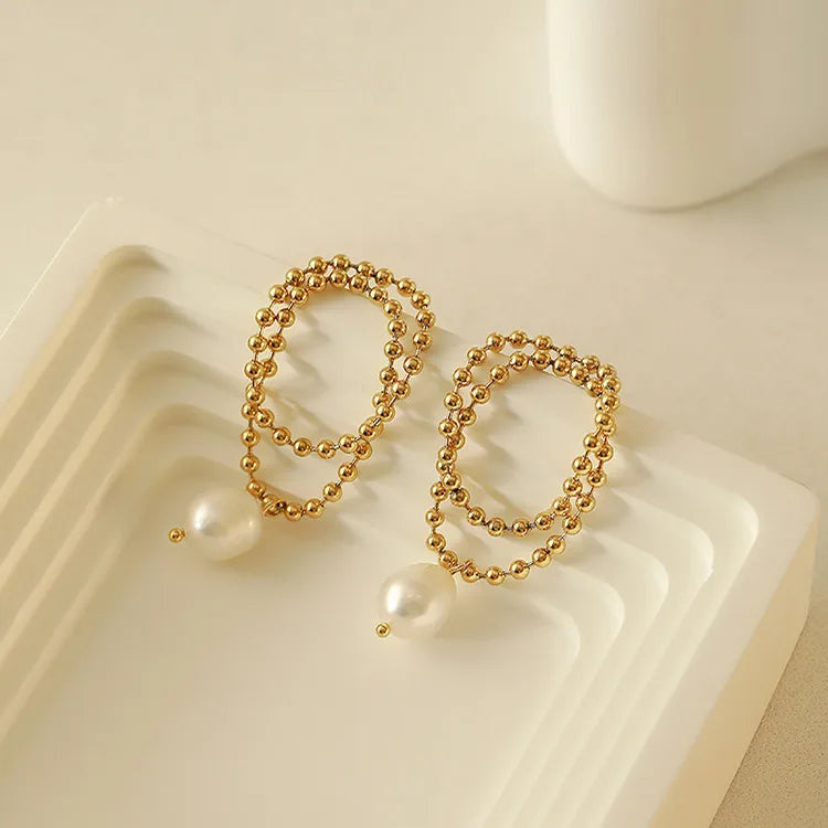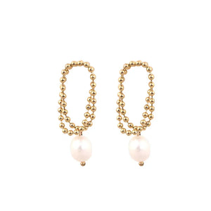 The Beaded Pearl Loop Earrings combine elegance with intricate detailing. Featuring a double loop of tiny golden beads adorned with a single freshwater pearl, these earrings make a versatile and sophisticated accessory. Perfect for adding a touch of class to any outfit.