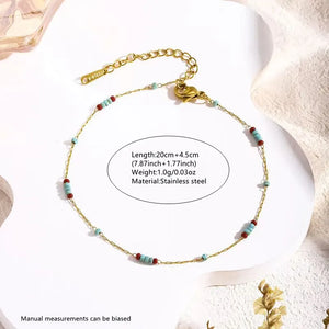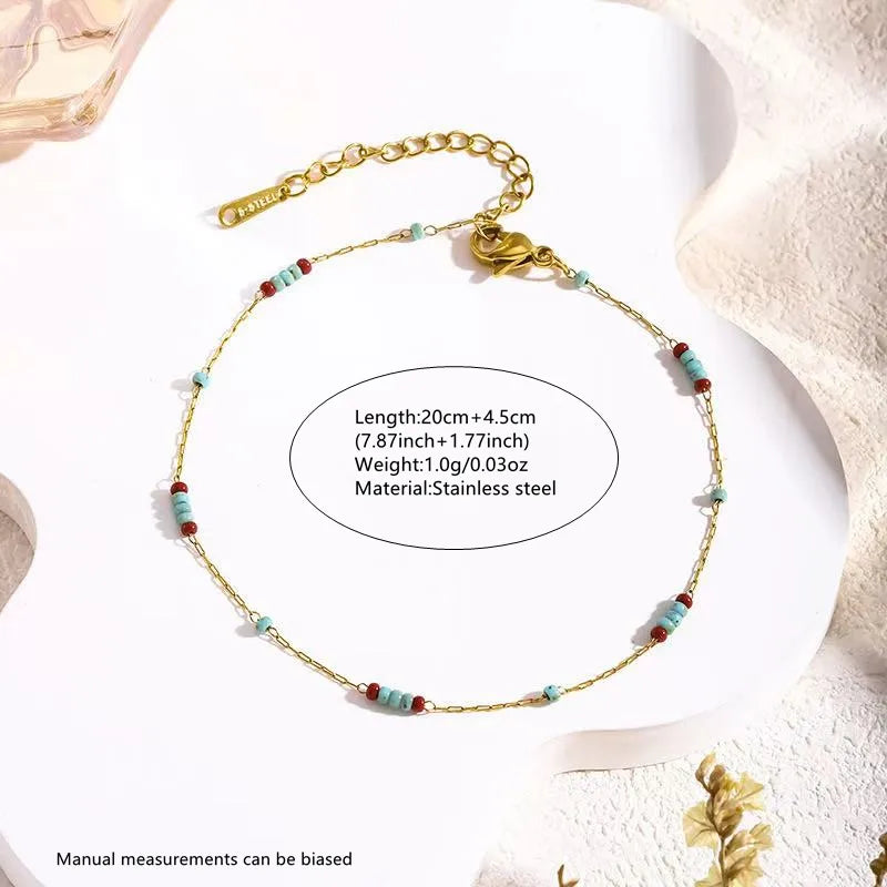 Add a touch of vibrancy to your look with the Colorful Bead Anklet. This dainty anklet features a delicate chain adorned with turquoise and red beads, giving it a playful and chic appeal. Perfect for casual outings, vacations, or beachside styling, this anklet complements both contemporary and traditional outfits effortlessly. Made with stainless steel for durability and hypoallergenic comfort.