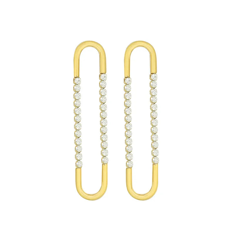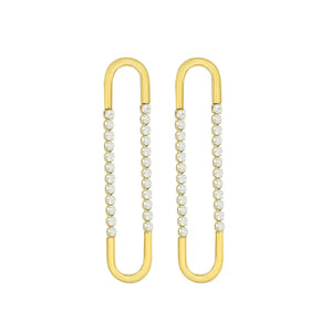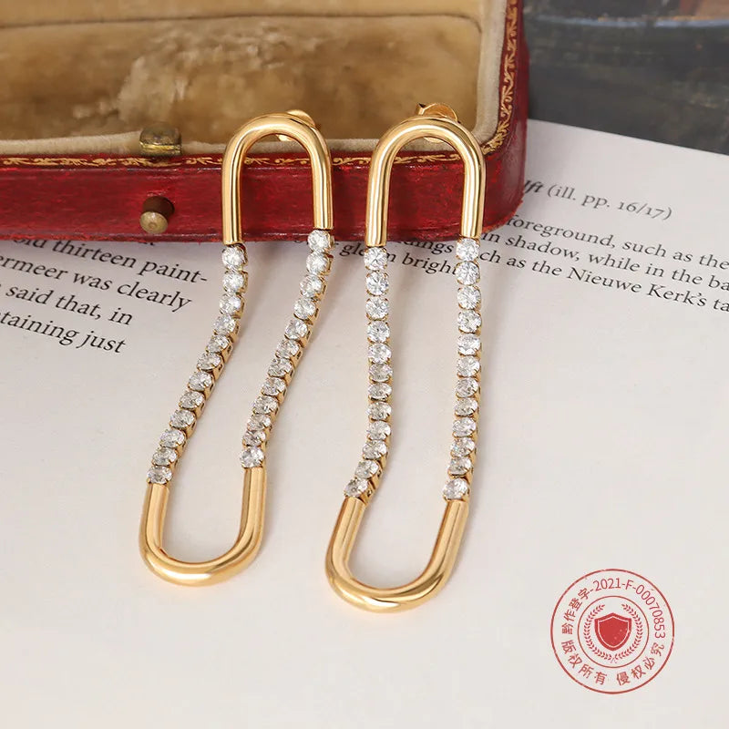 Make a bold statement with these Dazzling Long Dangling Earrings. Featuring a unique U-shaped gold design encrusted with sparkling cubic zirconia stones, these earrings add glamour and elegance to your evening look. Lightweight and hypoallergenic, they are crafted for comfort and luxury.