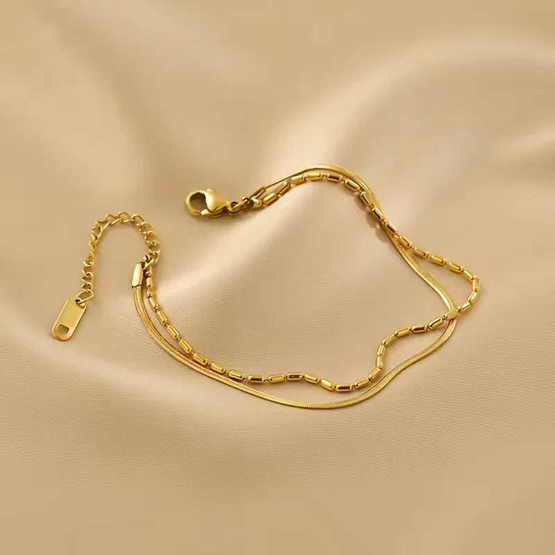 The Double Layer Gold Anklet is an elegant accessory that adds a touch of sophistication to your look. Featuring two distinct chain patterns—one sleek and the other textured—this anklet is crafted from stainless steel and plated with 18k gold. Lightweight and adjustable, it's designed for both comfort and style, making it perfect for any occasion.