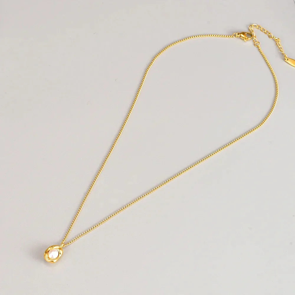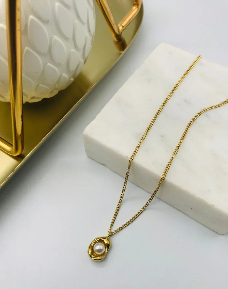 The Elegant Pearl Drop Pendant exudes sophistication with its sleek design and a lustrous pearl encased in an artistic golden frame. Perfect for both formal and casual occasions, this pendant is a timeless addition to your jewelry collection, blending elegance and charm seamlessly.