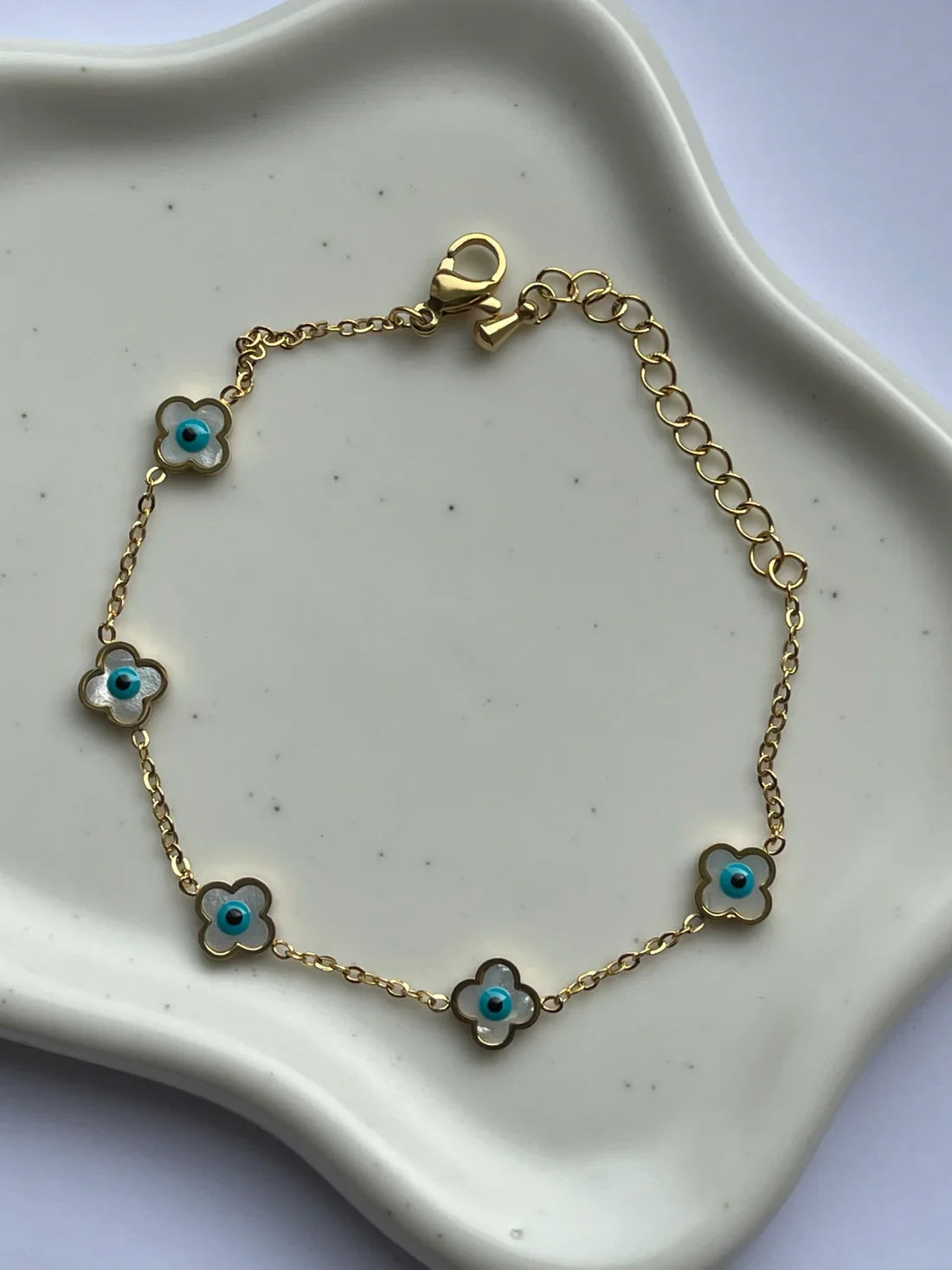 The Floral Evil Eye Bracelet combines a delicate floral motif with the protective power of the evil eye. Crafted with 18k gold-plated stainless steel, this bracelet features five floral-shaped evil eye charms, perfect for adding an element of charm and protection to your daily look. The adjustable chain ensures a comfortable fit, making it a versatile addition to your jewelry collection.