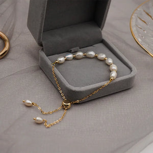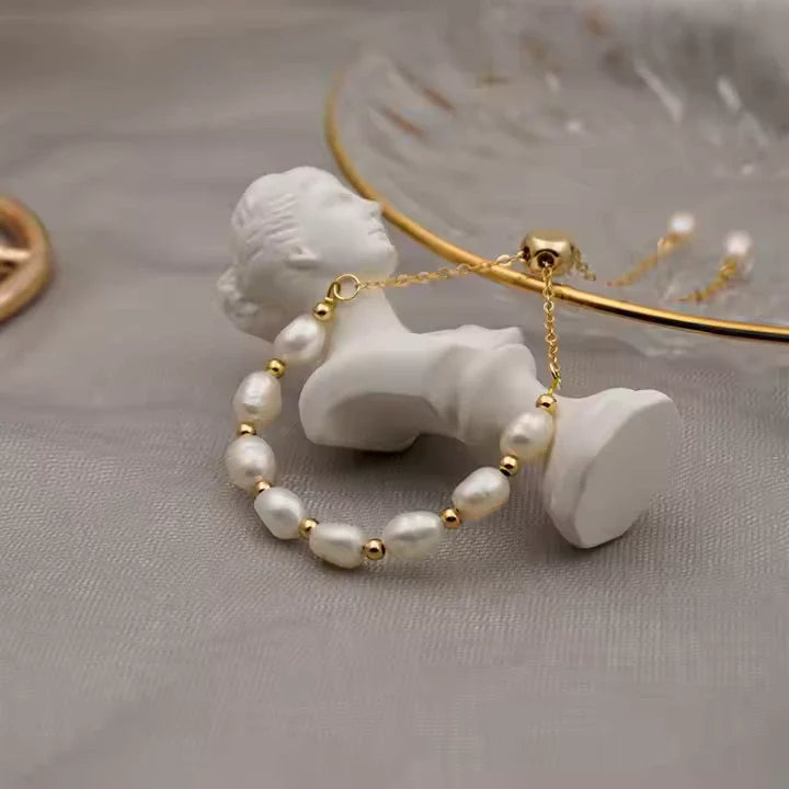 The Freshwater Pearl Gold Bracelet is a delicate and elegant accessory designed for those who appreciate timeless beauty. Featuring natural freshwater pearls interspersed with golden beads on a fine chain, this bracelet exudes sophistication. The adjustable clasp ensures a comfortable fit, making it perfect for any occasion.