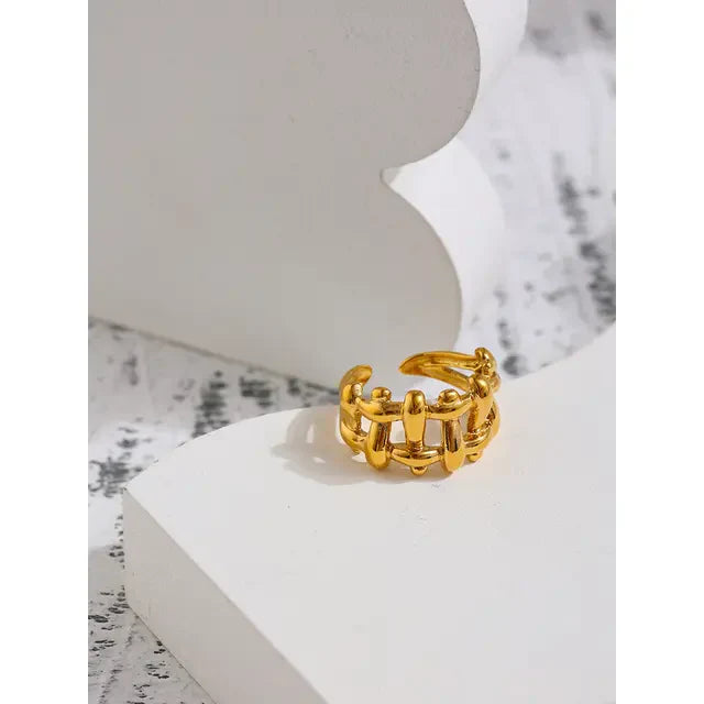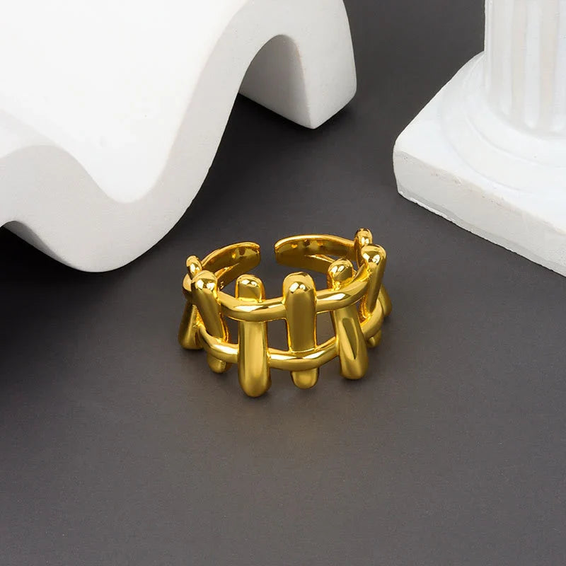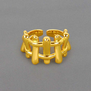 The Geometric Bold Statement Ring is a striking piece of jewelry designed to make an impact. Featuring a unique geometric structure and a gold-plated finish, this ring combines bold aesthetics with modern elegance. Its open design makes it adjustable, ensuring comfort and a perfect fit for any finger. This statement ring is perfect for those who love to showcase their individuality and add a touch of flair to their outfits.
