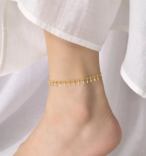 This Gold Chain Tassel Anklet is a stunning, minimalistic piece designed to add a delicate charm to your feet. The anklet features a fine gold-plated chain adorned with small tassel-like accents that move freely, creating an elegant swaying effect as you walk. Perfect for adding a touch of sophistication to casual outfits or beachwear, this anklet is both chic and versatile, ensuring that it stands out in any setting. Its adjustable length ensures the perfect fit, making it a timeless accessory for your jewelry collection.