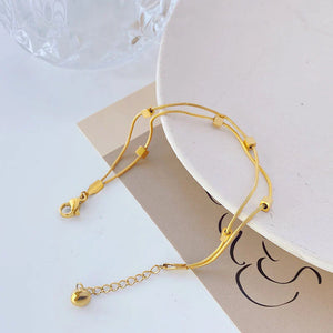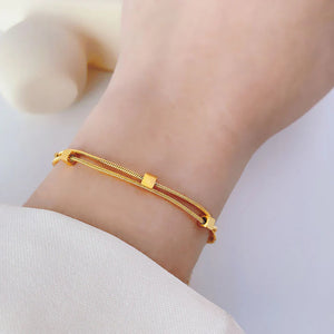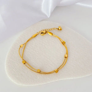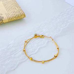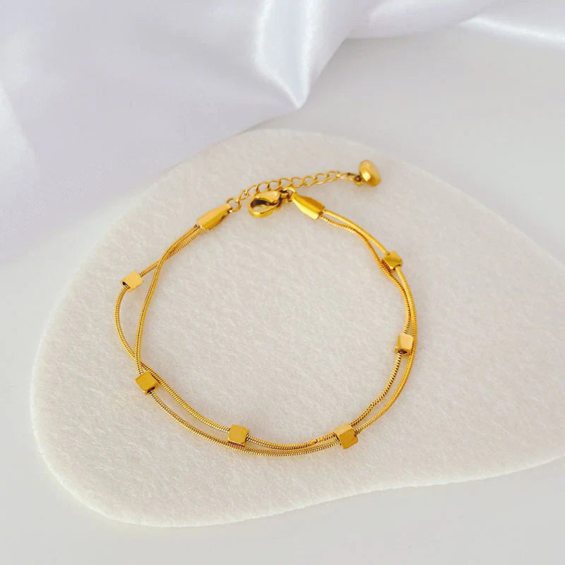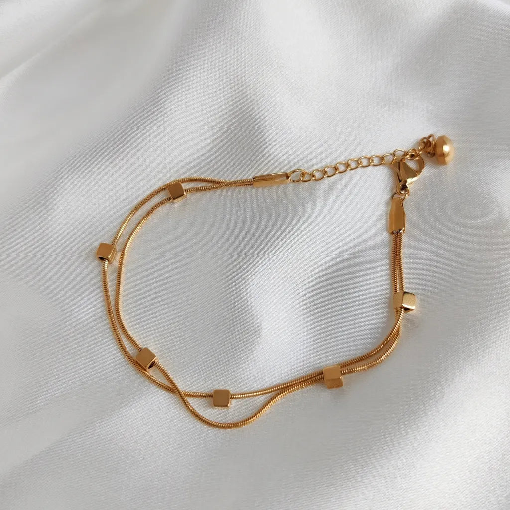 The Gold Cube Layered Bracelet is a modern and stylish piece that showcases minimalism with a twist. Featuring double-layered snake chains adorned with geometric gold cubes, this bracelet is perfect for adding an elegant touch to any look. Its durable gold-plated finish ensures long-lasting shine and sophistication.