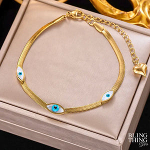 The Gold Evil Eye Bracelet is a blend of elegance and protection, featuring a delicate chain adorned with three intricately designed evil eye charms. Crafted with stainless steel and 18k gold plating, this bracelet is lightweight and durable, perfect for daily wear or special occasions. Its herringbone chain adds a touch of sophistication, making it a timeless addition to your jewelry collection.