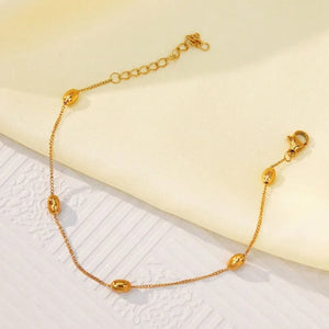 The Gold Oval Bead Anklet exudes timeless charm with its minimalist design. Featuring a delicate chain interspersed with polished oval beads, this anklet is an elegant addition to any jewelry collection. Its simple yet sophisticated look makes it perfect for everyday wear or special occasions. Crafted with 18K gold plating, it ensures hypoallergenic comfort and lasting shine.