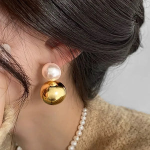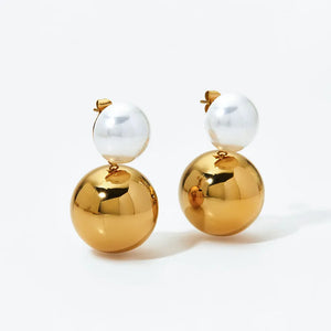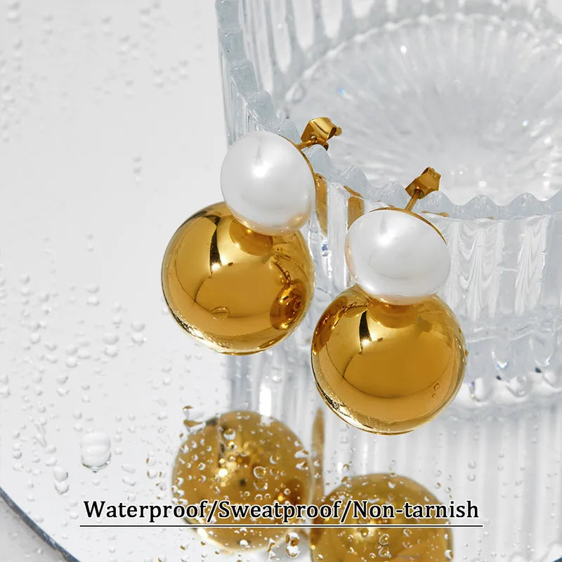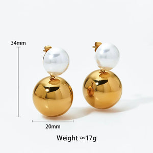 These Gold Pearl Double Ball Earrings are the epitome of bold elegance. Featuring a unique design with a lustrous gold sphere paired with a shimmering pearl, these earrings are waterproof, sweatproof, and non-tarnish. Perfect for making a statement at parties, weddings, or formal events, they bring sophistication and charm to any look.