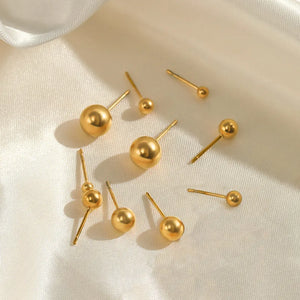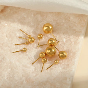 The Golden Ball Studs Set features four pairs of minimalist and elegant gold-plated ball stud earrings in varying sizes (3mm, 4mm, 5mm, 6mm). Designed for versatility, these timeless studs add a touch of sophistication to any outfit and are suitable for all occasions.