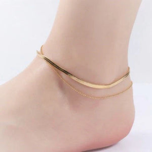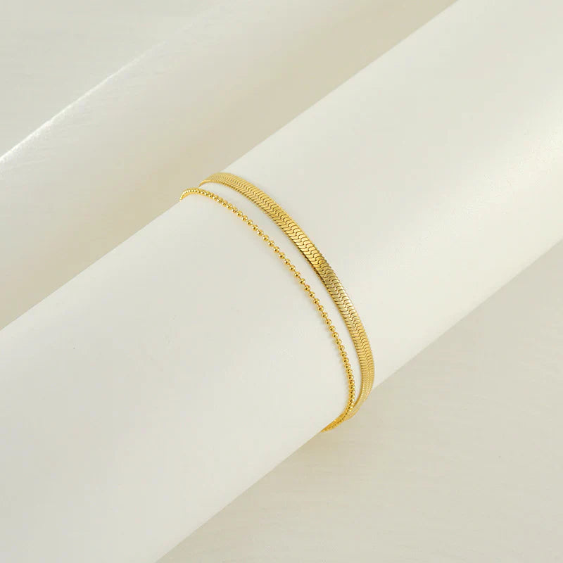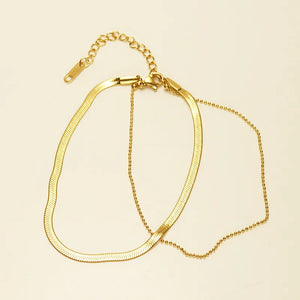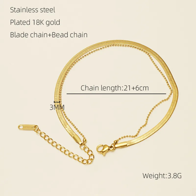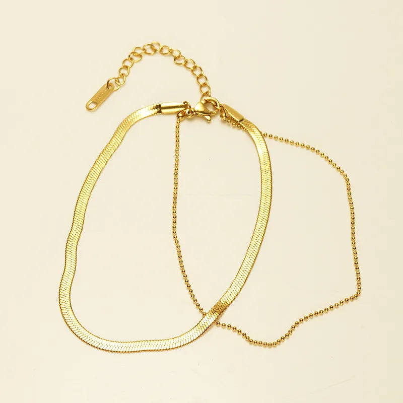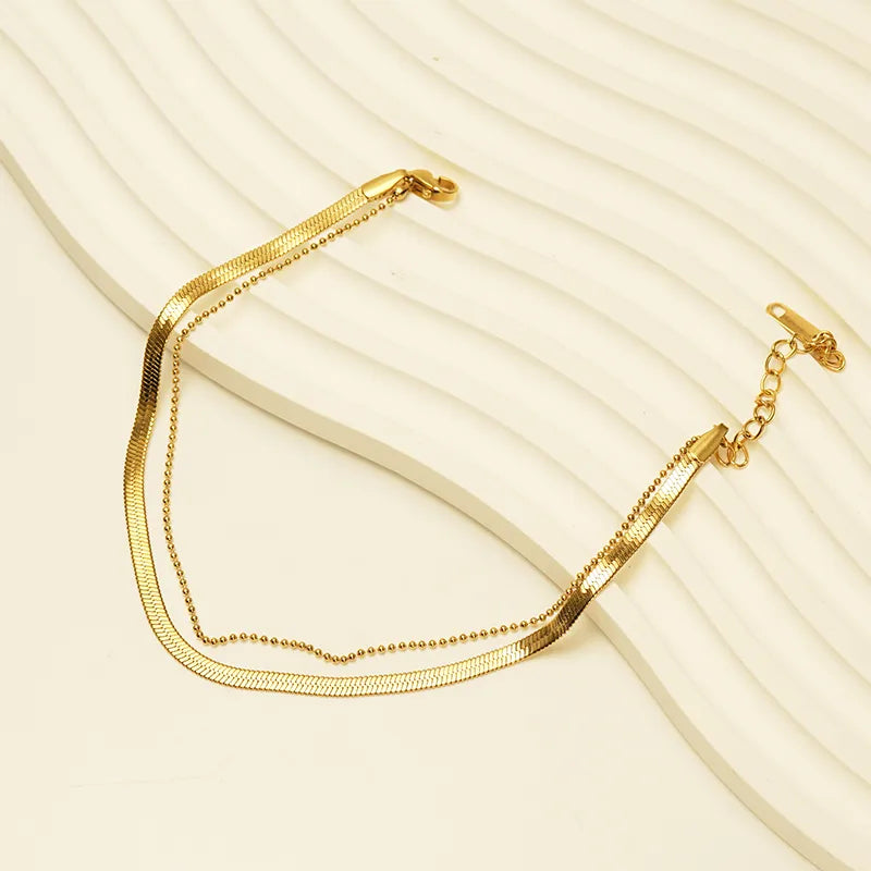 Grace your ankles with the Golden Dreams Layered Anklet, a modern and sleek accessory designed to elevate any outfit. This anklet features two intricately layered chains—a herringbone chain and a ball chain—crafted in a luxurious gold tone. Its versatile design makes it perfect for formal occasions, casual outings, or even festive celebrations. Hypoallergenic and durable, this anklet is a must-have for every jewelry lover.