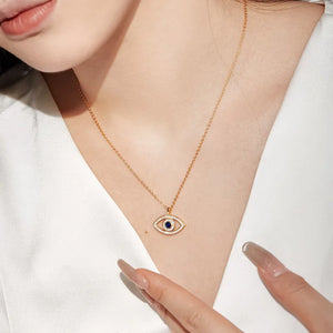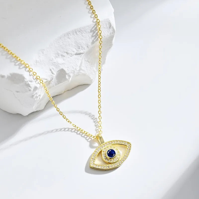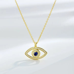 The Golden Eye Necklace is a mesmerizing piece that exudes elegance and protection. Featuring a striking evil eye pendant adorned with a sapphire-colored center stone and sparkling cubic zirconia, this necklace combines timeless charm with a modern twist. Perfect for adding a hint of mystique and style to any outfit.