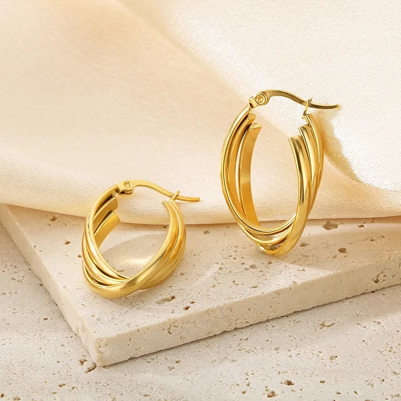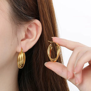 The Golden Glow Hoops are a radiant addition to your jewelry collection. Featuring a layered design with a smooth gold finish, these earrings exude elegance and sophistication. Their versatile design makes them perfect for both casual outings and formal events.