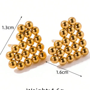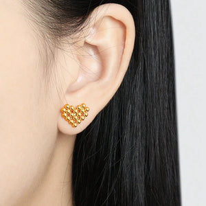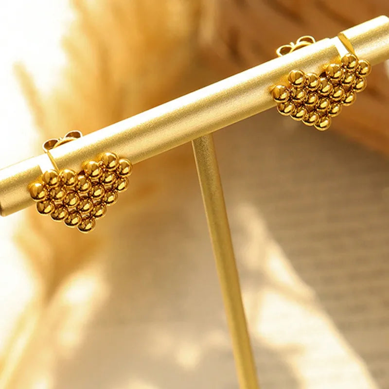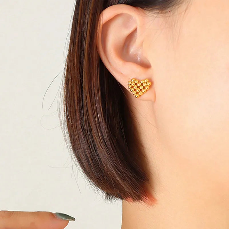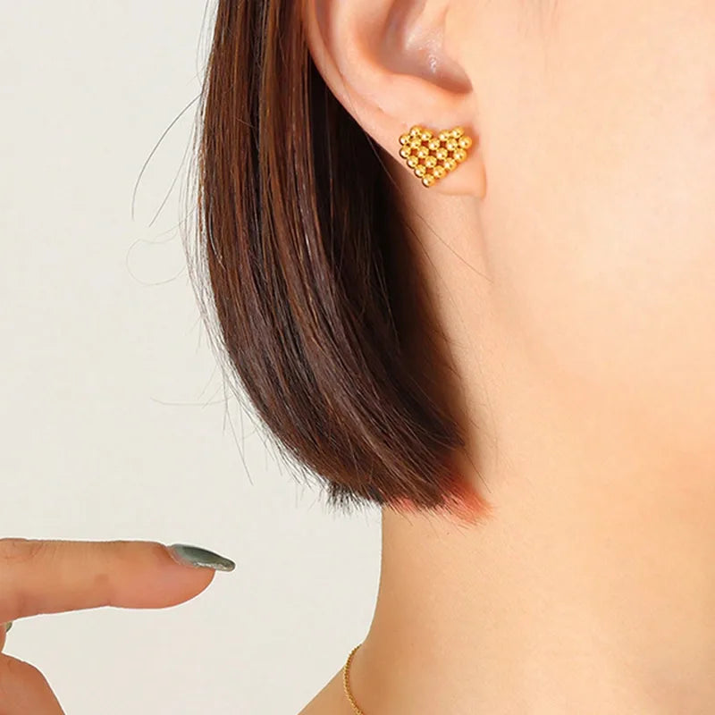 The Heart Gold Stud Earrings are a charming blend of elegance and playfulness. Crafted in a unique beaded heart shape, these 18k gold-plated earrings are lightweight and hypoallergenic, perfect for adding a touch of warmth to any outfit. These stud earrings make a versatile choice for daily wear or special occasions, offering both style and comfort.