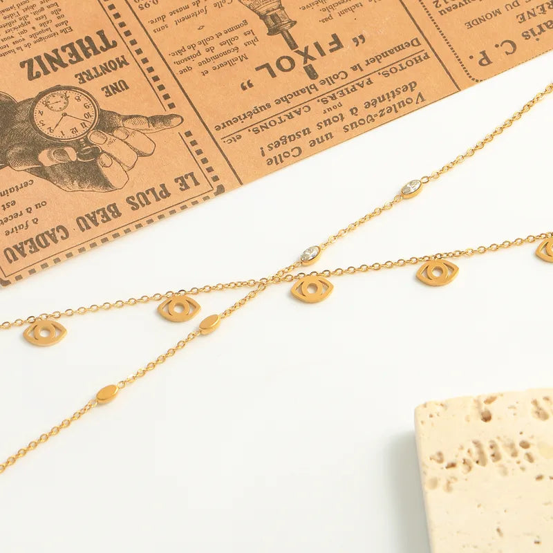 The Layered Evil Eye Anklet is an elegant statement piece, featuring double-layered chains adorned with delicate evil eye charms and crystal embellishments. Designed to keep negative energy at bay while adding a chic flair to your outfit, this anklet is a perfect accessory for casual outings, beach vacations, or evening wear. Made with high-quality materials, this piece is durable, hypoallergenic, and effortlessly stylish.