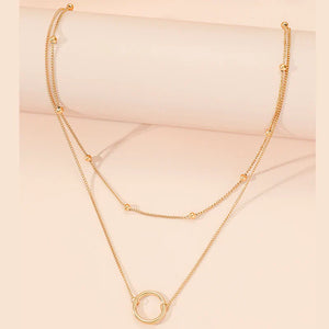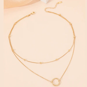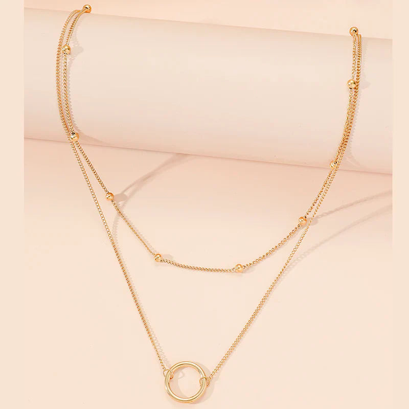 The Layered Gold Circle Necklace is a chic addition to any jewelry collection. Featuring a minimalist circular pendant and dainty layered chains adorned with delicate gold beads, this necklace is designed to make a sophisticated statement. Its versatile design makes it ideal for layering or wearing as a standout piece.