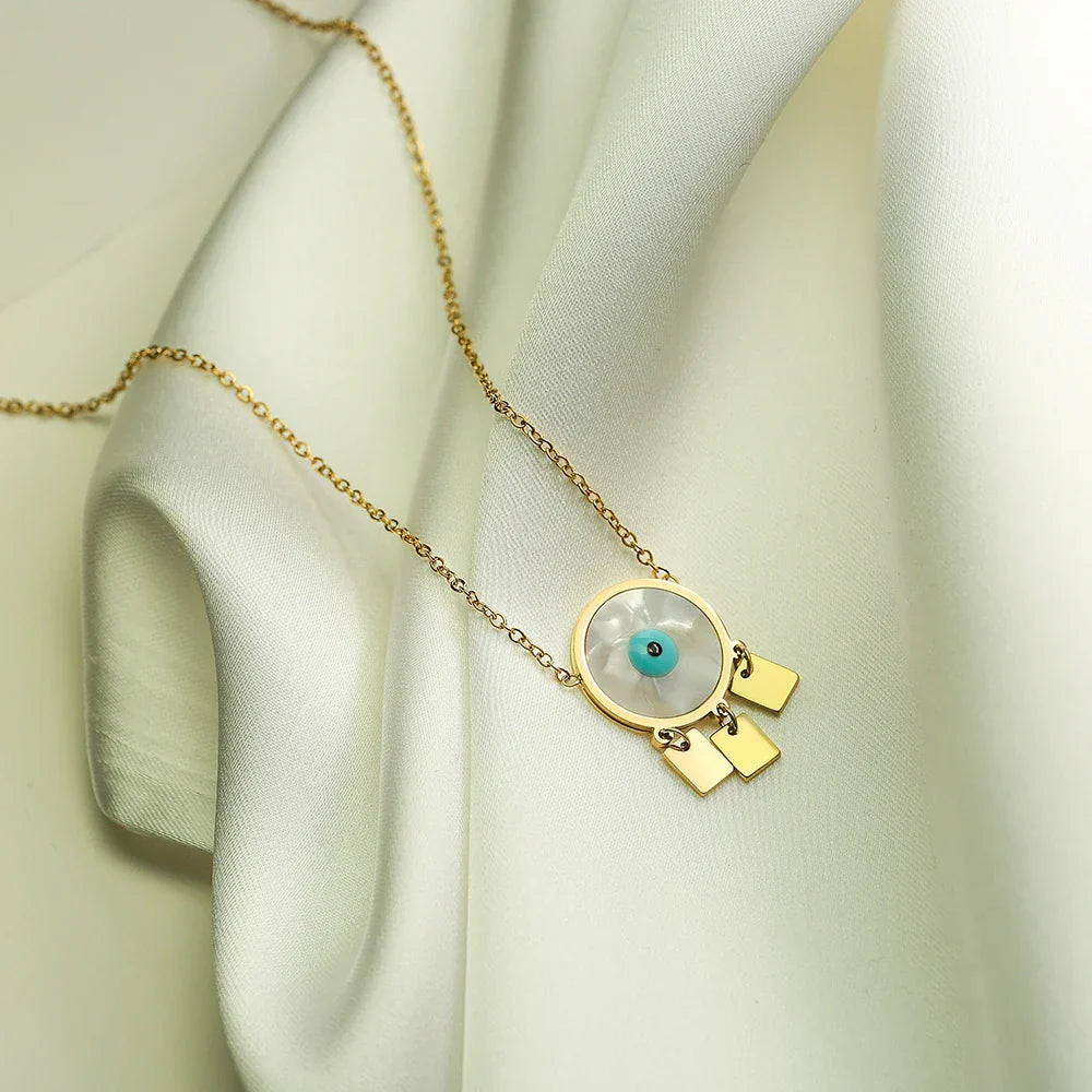 The Mystic Guardian Necklace is an enchanting piece featuring a radiant Evil Eye centerpiece set against a luminous shell-like base. Suspended below are charming gold-toned danglers, making it a unique blend of mysticism and style. This necklace serves as both a fashion statement and a symbol of spiritual protection.