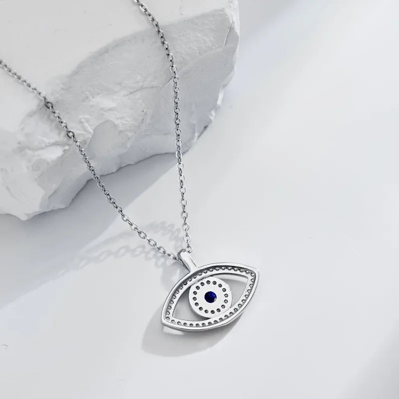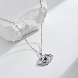 The Silver Eye Necklace is a sophisticated blend of elegance and symbolism. Designed with a shimmering evil eye pendant, this piece features a sapphire-toned center stone surrounded by glittering cubic zirconia. Crafted in silver, it adds a touch of modernity and mystique to your jewelry collection.