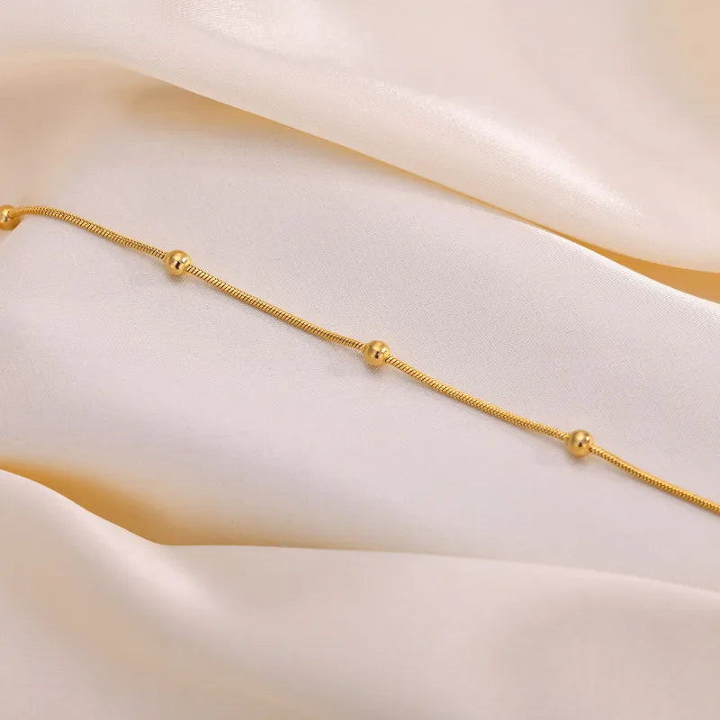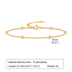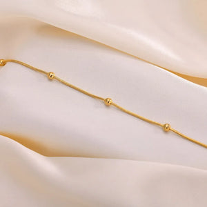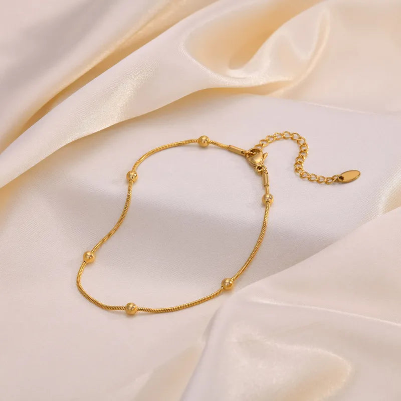 The Sleek Gold Ball Anklet combines simplicity with elegance. Featuring a delicate gold chain adorned with minimal gold ball accents, this anklet is a versatile accessory for any occasion. Lightweight and hypoallergenic, it ensures comfort and style all day long. Its adjustable chain makes it suitable for all ankle sizes.