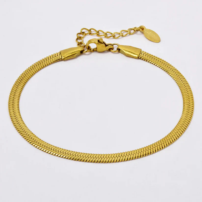 The Snake Chain Bracelet is a sleek and elegant piece designed for everyday sophistication. With its smooth, fluid design and high-polish finish, this bracelet is a timeless addition to your jewelry collection. Made from stainless steel and plated with premium gold, it ensures durability and comfort for all-day wear.