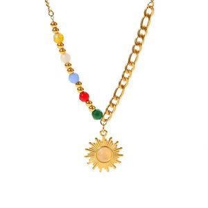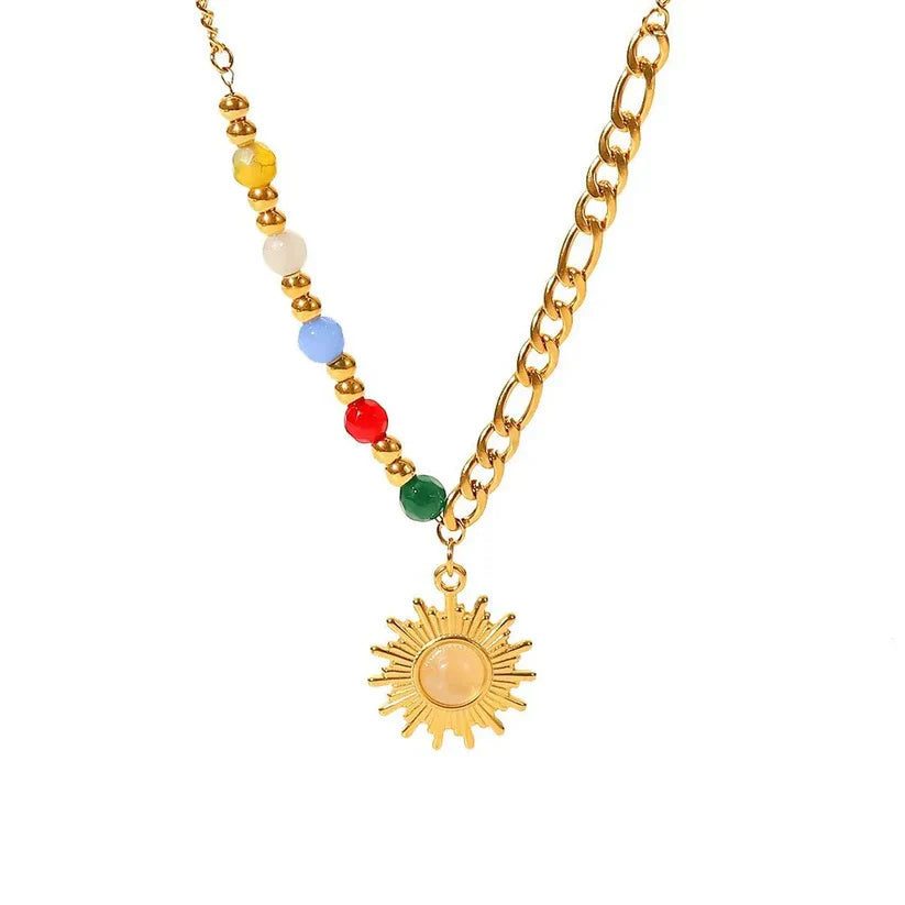 The Sunburst Mixed Charm Necklace is a vibrant and bold statement piece that combines colorful beads with a radiant sunburst charm. Designed to bring warmth and positivity to your style, this necklace exudes playful elegance and is perfect for those who love unique, eye-catching jewelry.