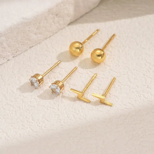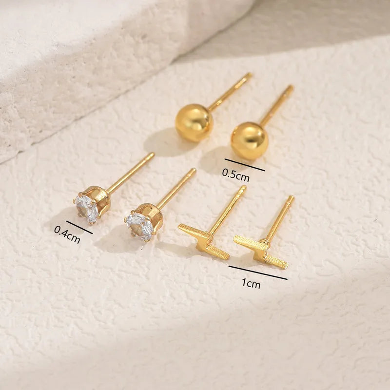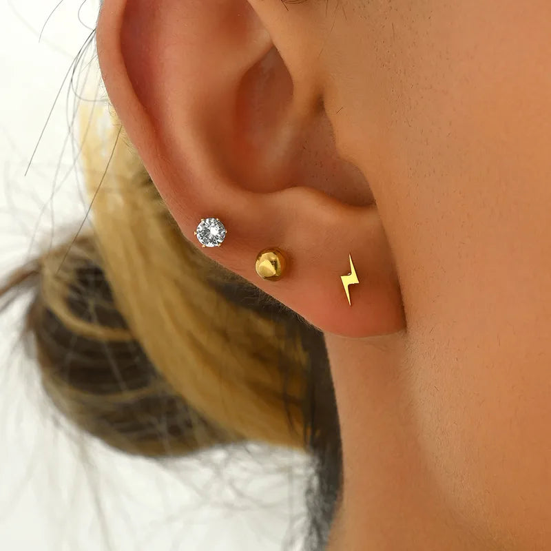 The Triple Play Stud Set is a versatile and stylish addition to your jewelry collection, featuring three pairs of dainty studs. This set includes classic gold spheres, dazzling cubic zirconia, and bold lightning bolts. Perfect for mixing and matching, this set adds a touch of personality to every outfit.